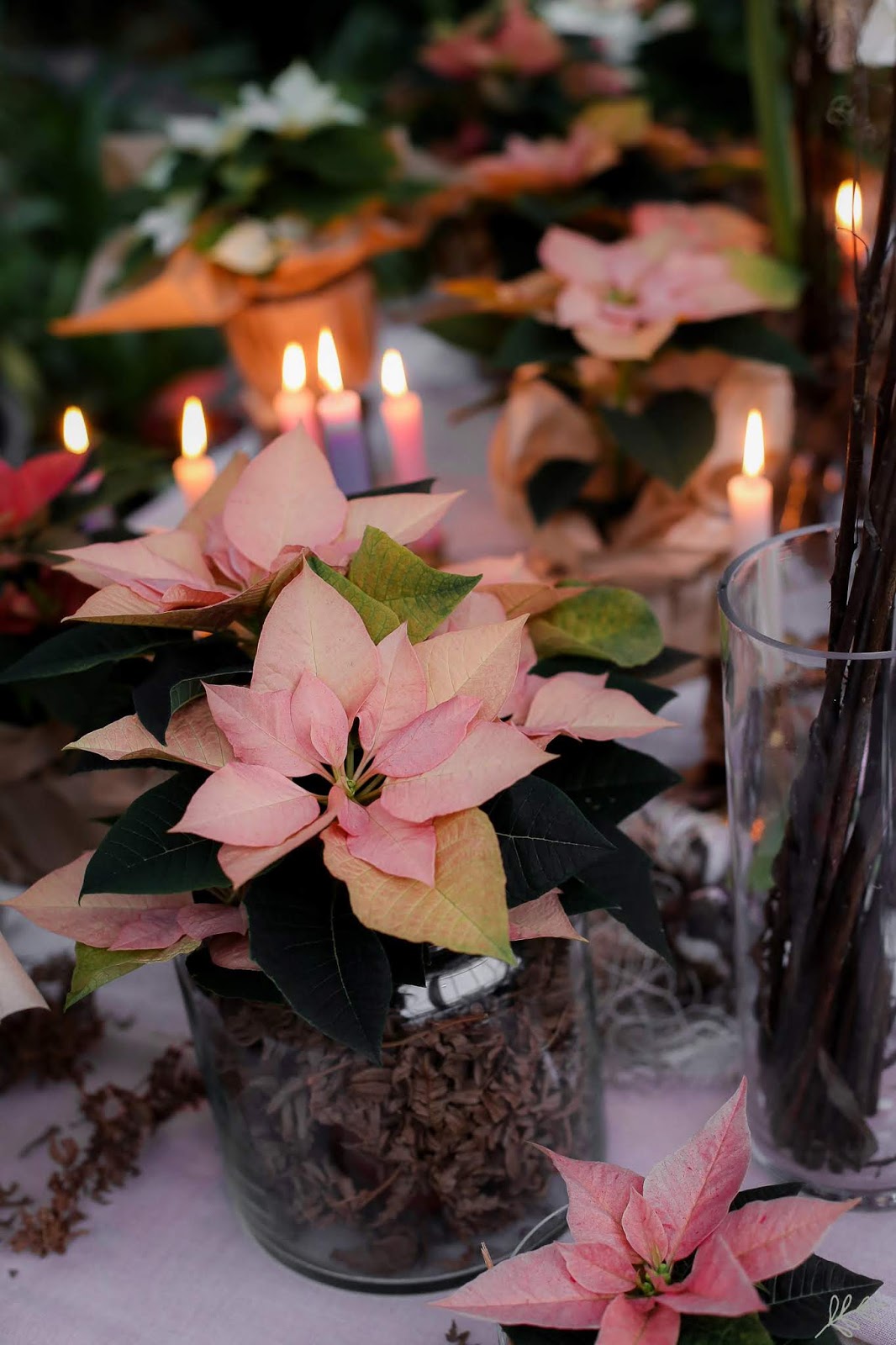Fittonia, joulutähti ’Autumn Leaves’, mehiruusukkeet ja sophora toimii loistavasti yhdessä.