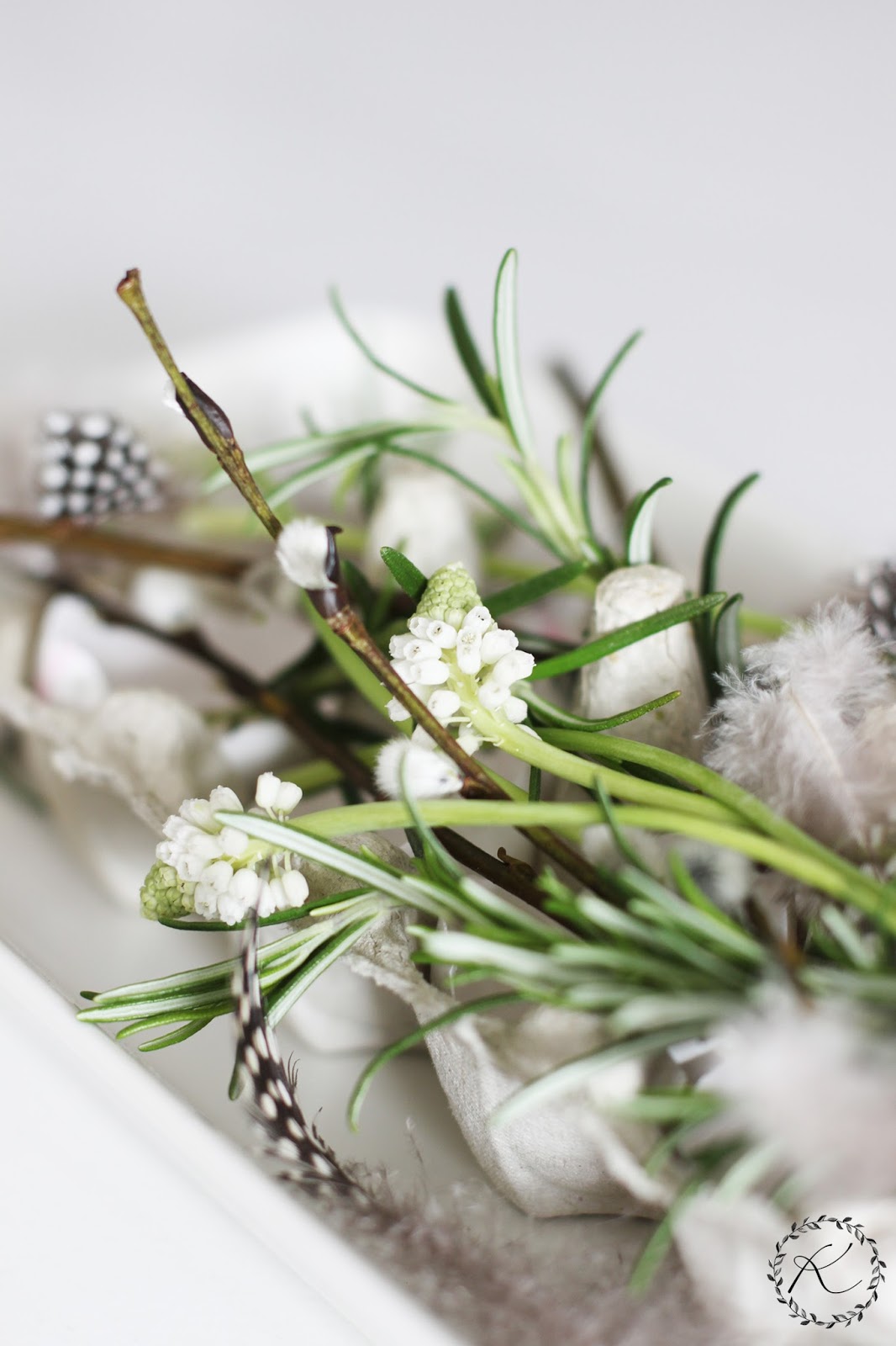Pajunoksia lasten askarteluista, rosmariinia keittiöstä, helmililjoja terassilta, edellisvuoden höyheniä, munakenno, munankuoria ja tarjoiluastia. Siinä ainekset.