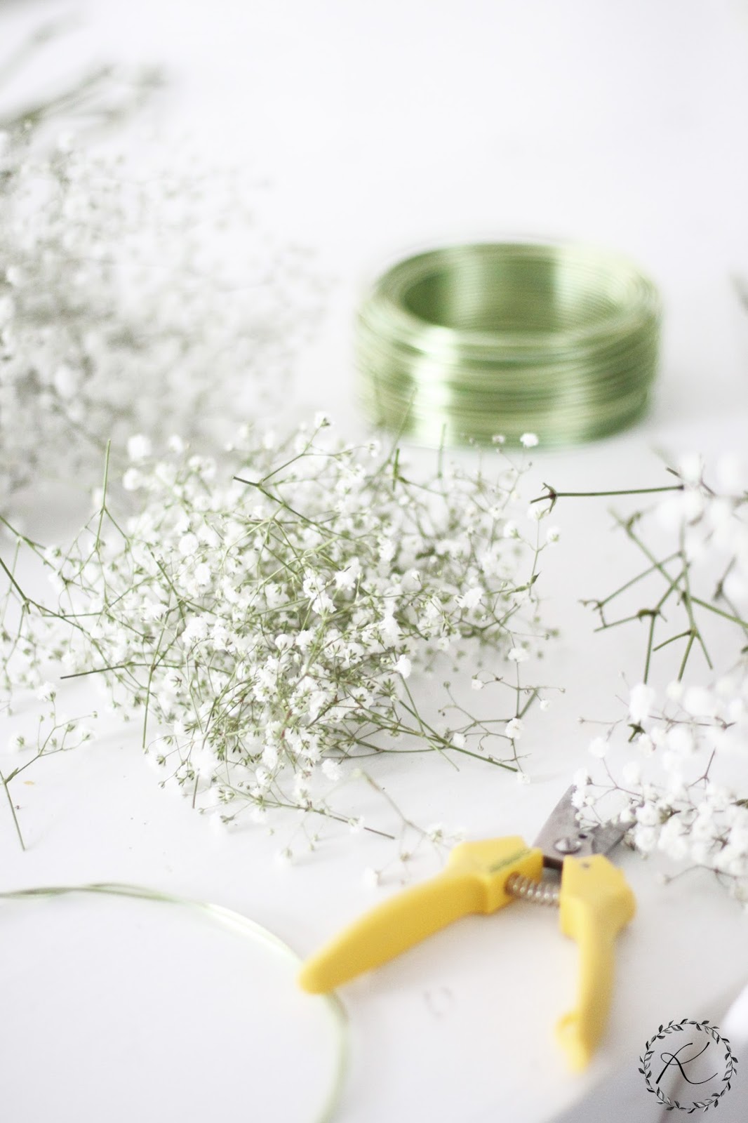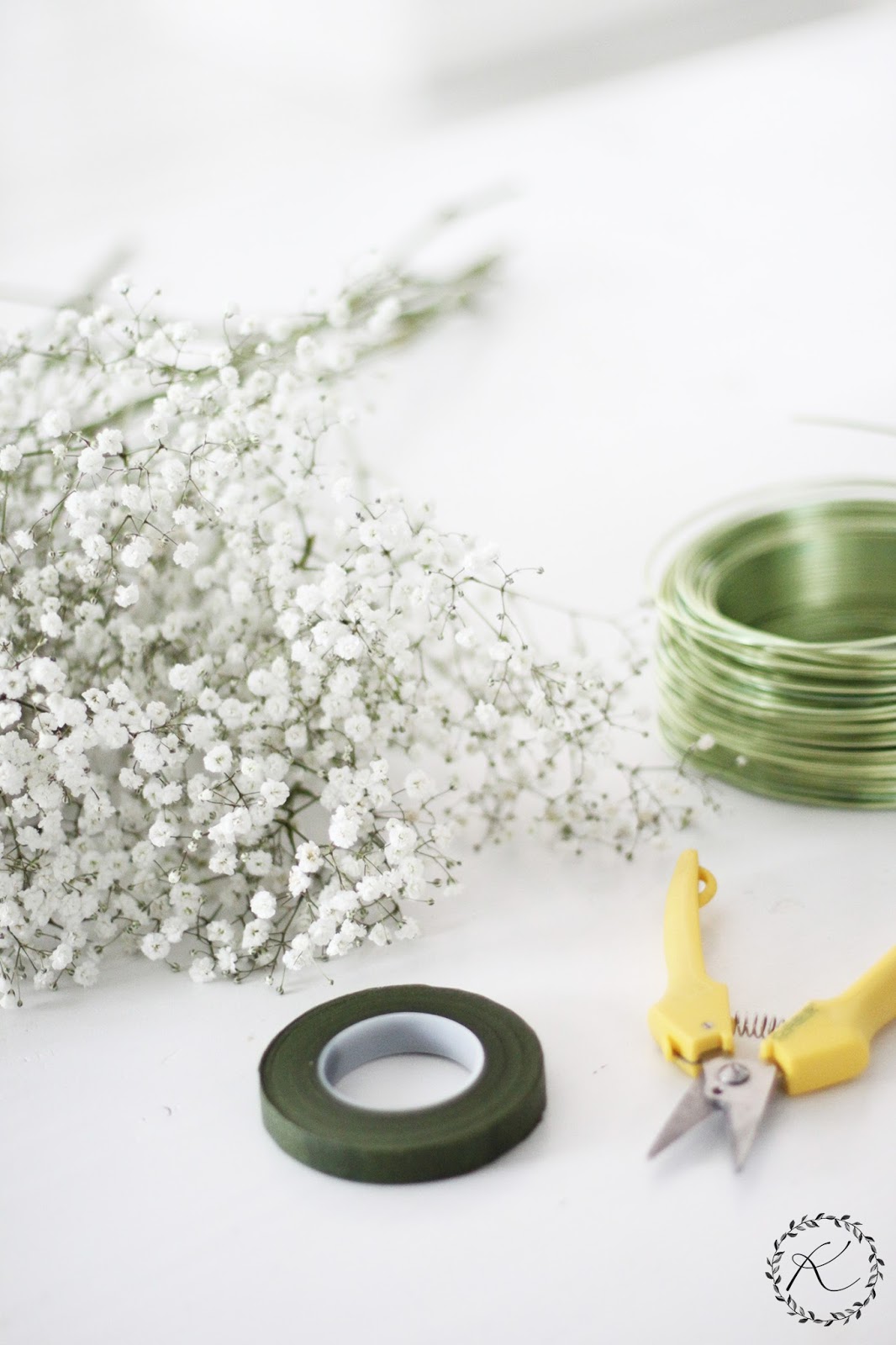 1. Kerää kaikki tarvikkeet pöydälle; kukat, alumiinilanka, kukkateippi ja sakset.