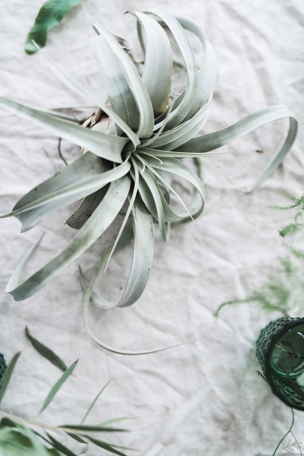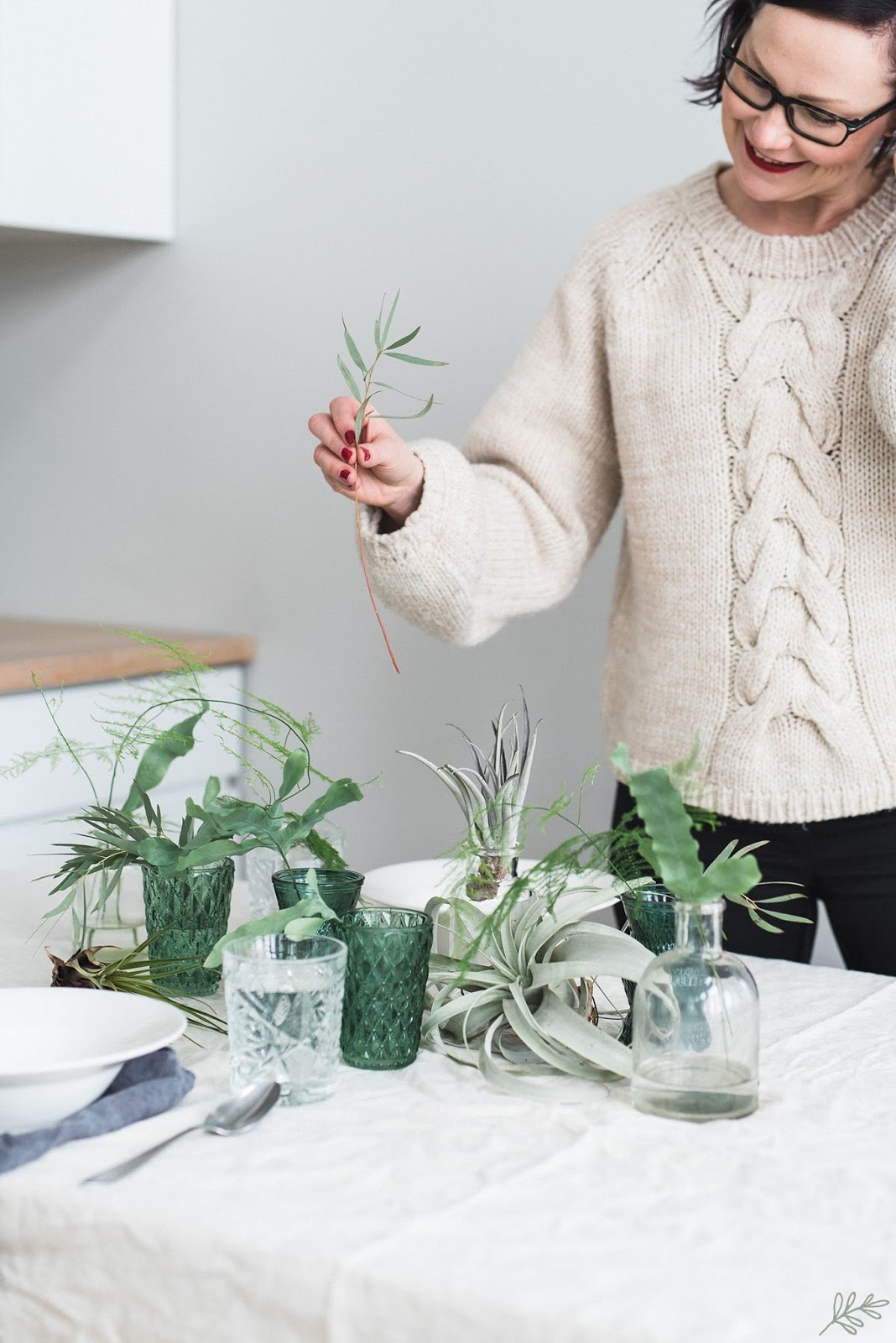 Leikkovihreistä tässä on unelman oksia ja kultaimarteen lehtiä. Molempia voi napsia omista viherkasveista tai niitä myydään myös kukkakaupoissa ihan leikkovihreinäkin valmiina. Lisäksi tässä on eukalyptuksen oksia – ja niitä ilmakasveja. Ne antavat oman fiiliksensä, koska ne voidaan sijoittaa vain suoraan pöydälle. Oman tunnelmansa kattaukseen tuovat tietenkin ryppyinen pellavaliina ja tyylikkäät astiat.