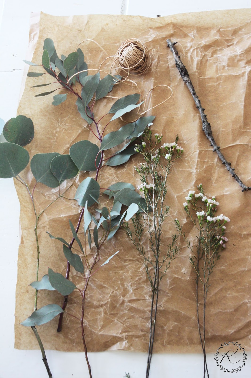Keräsin tätä varten pöydälle eukalyptuksen ja vahakukan oksia, oksanpätkän ja paperinarua.