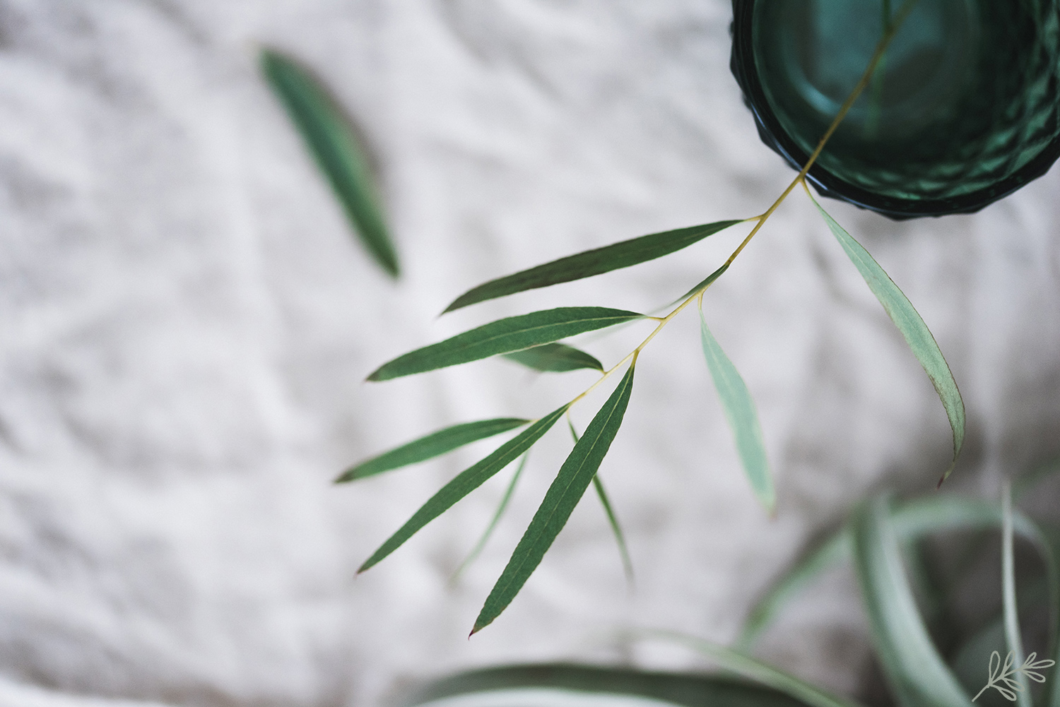 Servettirullan kääräisin kiinni juuttinarulla ja koristeena on pieni eukalyptuksen oksa. Pöydällä on lisäksi muutamia eukalyptuksen irtolehtiä. Miten pienellä sitä saakin loihdittua ruokapöytään myös silmänruokaa!