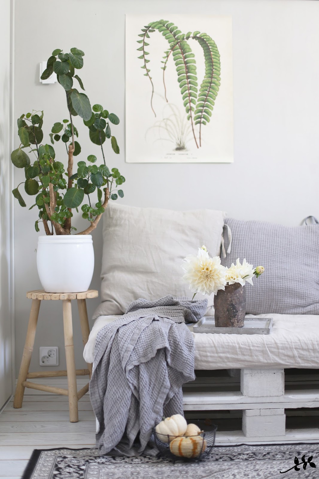 Nyt ei ollakaan ihan perinteisen kukkakimpun äärellä, vaan tein seinäkoristeen leikkovihreistä. On se vaan aina niin virkistävää päästää luovuus valloilleen ja luoda kokonaan uutta! Olen ihastellut Pinterestissä erilaisia langoista tehtyjä seinäkoristeitä, ja halusin tehdä oman. Mutta tietysti kasveista.
