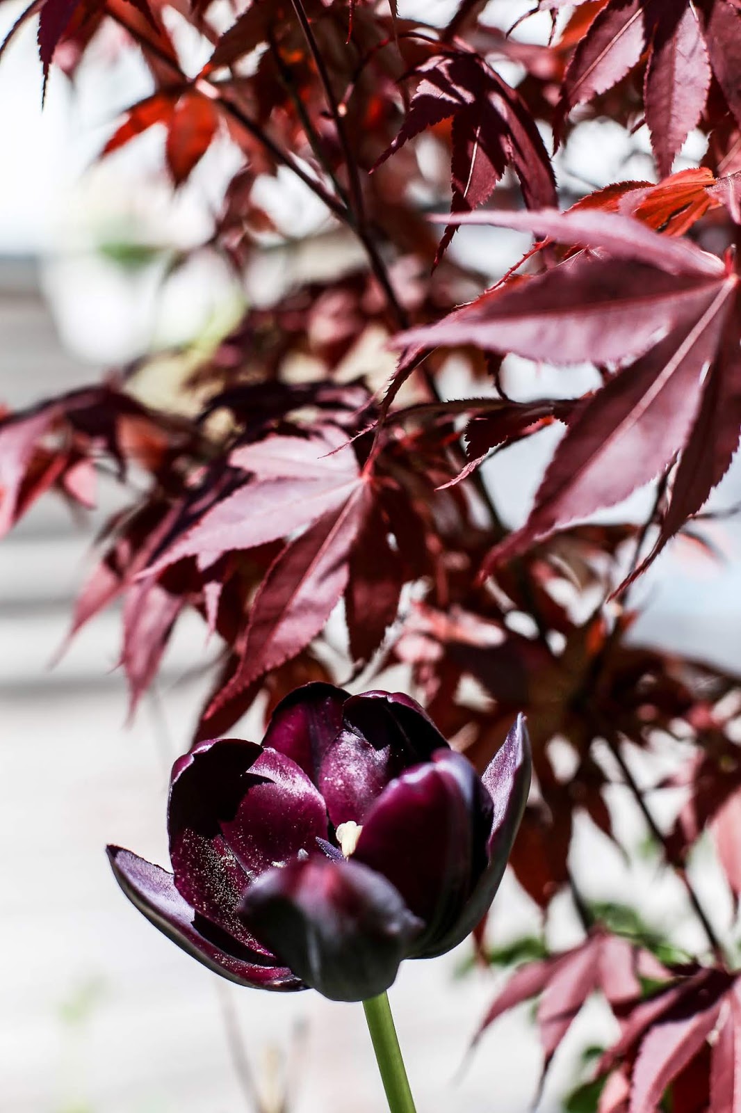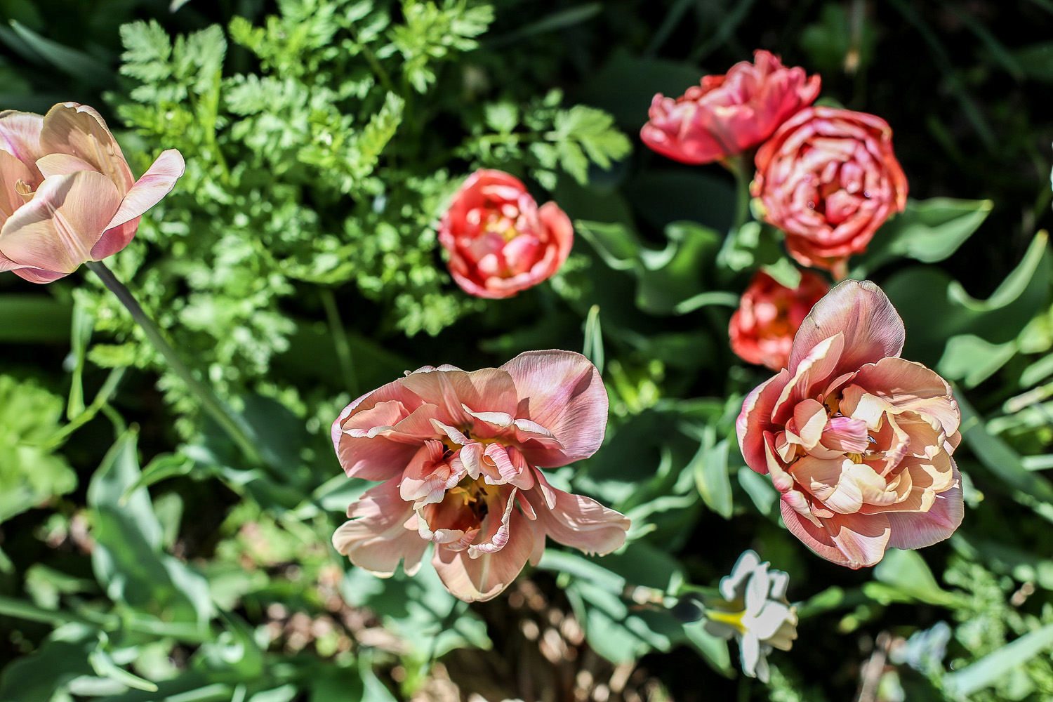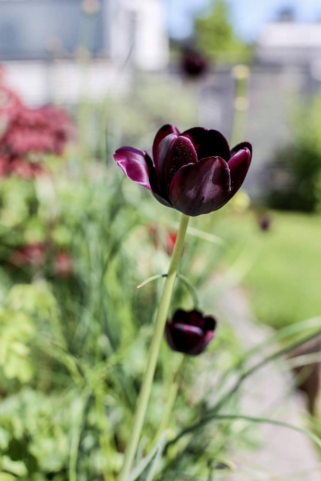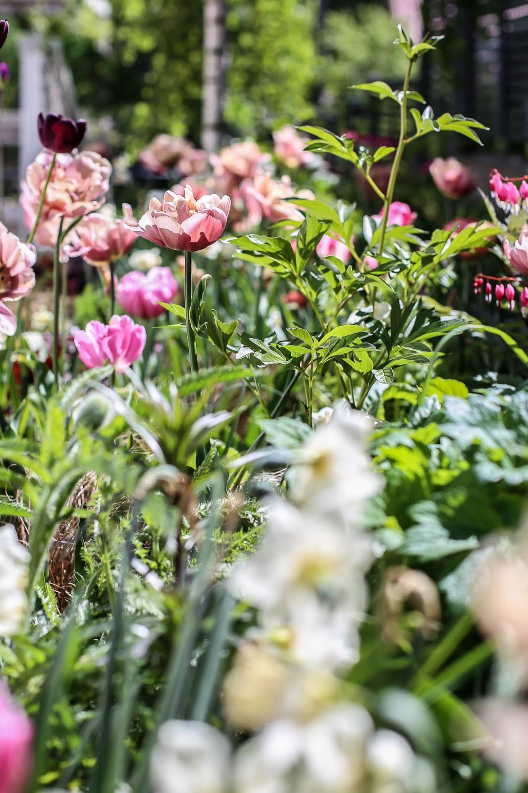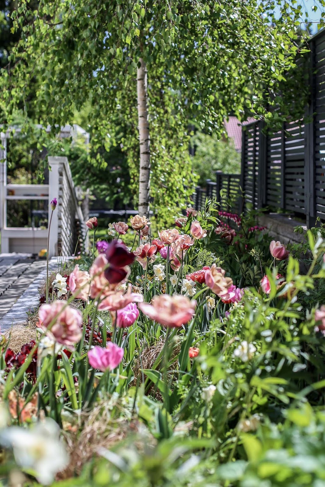 Nämä värilliset tulppaanit, keijunkukat ja upeat japaninvaahterat sitovat tummat värit yhteen muuten vihreän kokonaisuuden keskellä. Pidän siitä, että kukkapenkissä tapahtuu koko ajan ja ilme muuttuu. Dynaamisessa istutuksessa kasvit on enemmän sekaisin verrattuna tavanomaiseen penkkiin, jossa kaikilla lajeilla on oma staattinen paikkansa kokonaisuudessa. Pidän harkitusta villeydestä. Se sopii mielestäni paikkaan, jossa istutuksella on tarkat raamit (kuten rajattu istutusalue), modernihko ympäristö tai esimerkiksi julkisilla alueilla rakennettu kaupunkiympäristö.