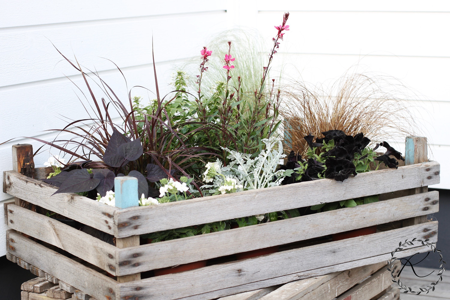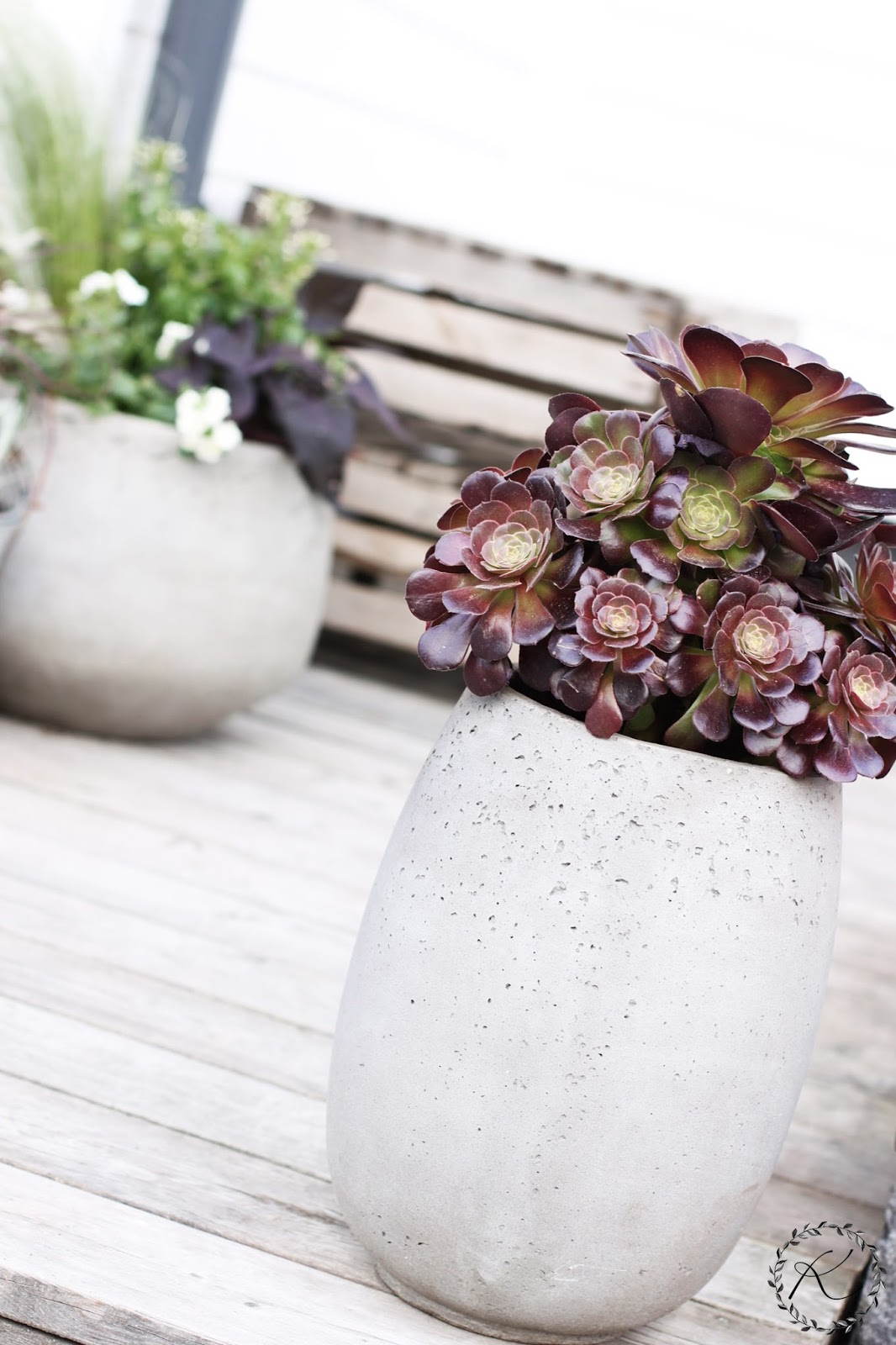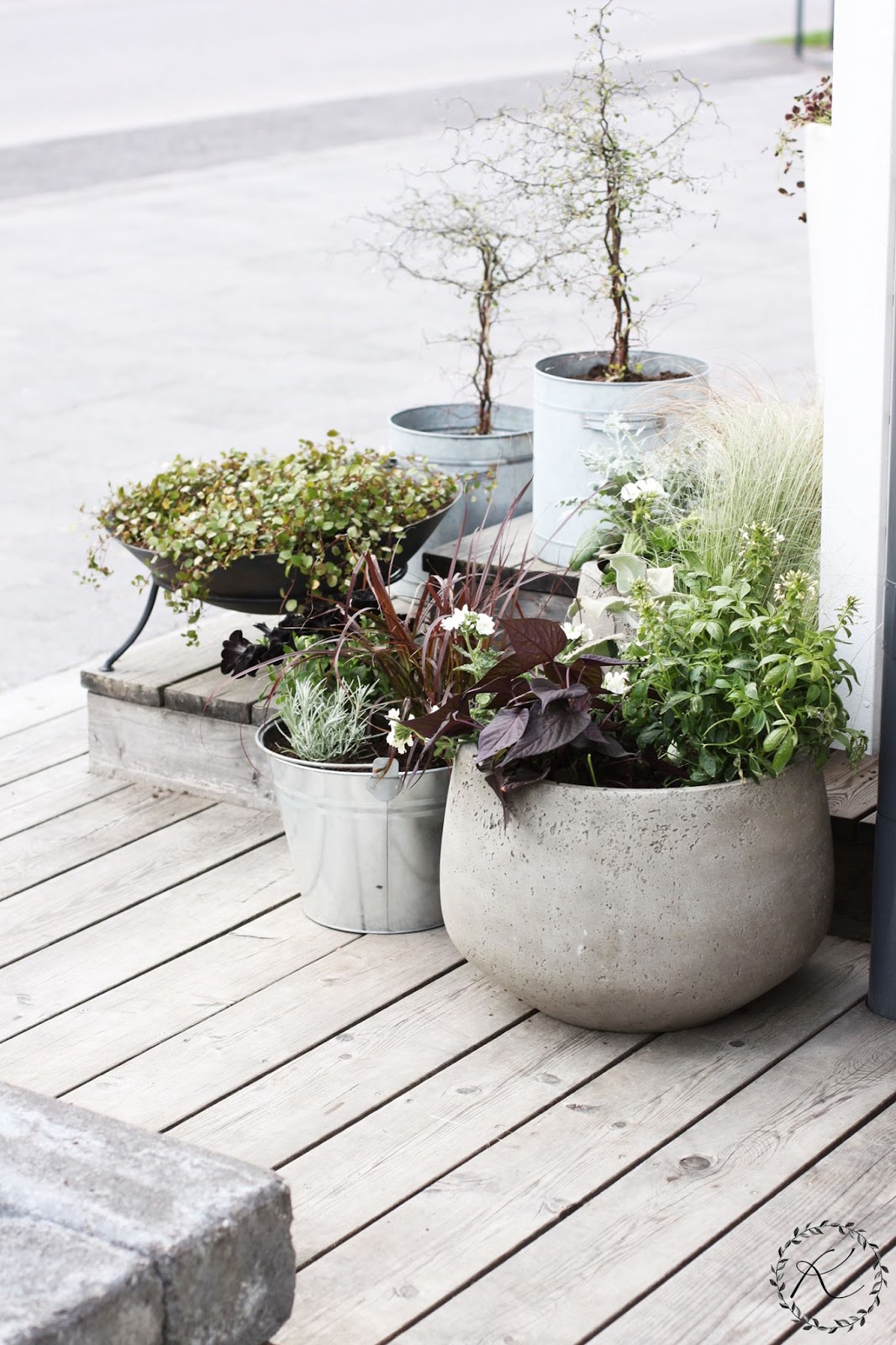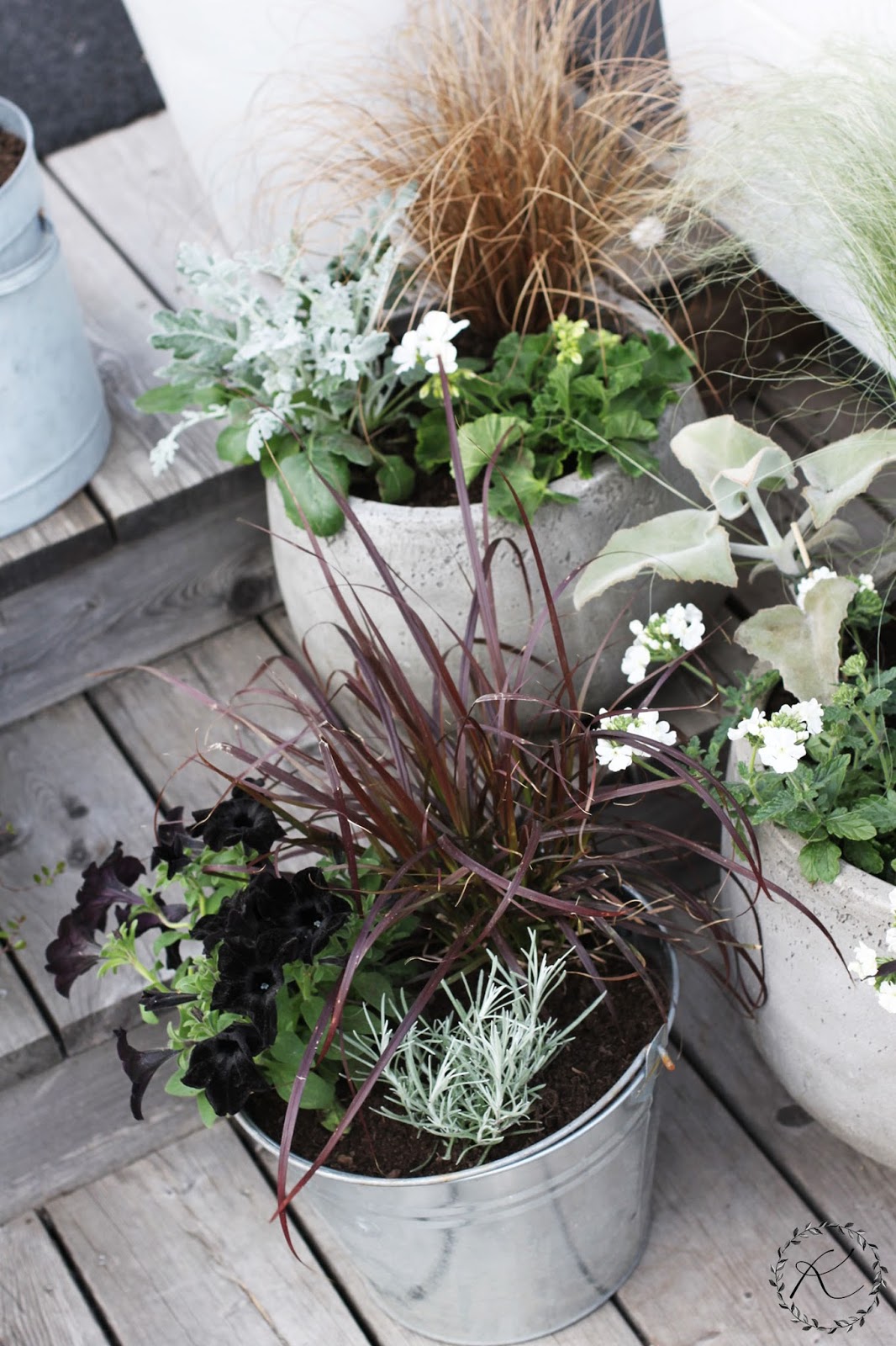 Mutta siis. Takaisin hetkeen! Olen istutellut näihin ruukkuihin hortensioita, muratteja, lankaköynnöksiä, ruusun ja enkelinkellon.