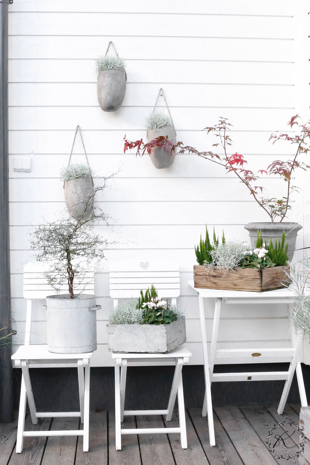 Syksyn upeimmat kasvit eli hopealangat pujahtivat myös pikkuamppeleihin ja pari kesää ilahduttanut ilmava kummituspuu sopii kokonaisuuteen loistavasti. Syksyisestä terassinurkasta tuli raikas ja rento – ja muodostui kädenkäänteessä. Sitten vain kastelua säiden mukaan.